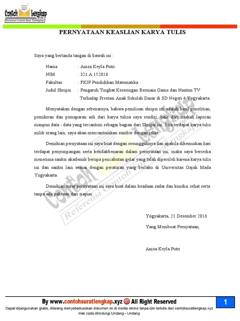 Namun untuk kasus tertentu, adakalanya harus menggunakan pernyataan tertulis. Dengan surat ini, kita dapat mengikat seseorang untuk keperluan sesuai dengan kasus atau pernyataan yang ingin di lakukan. Skripsi sebagai salah satu syarat untuk menyelesaikan strata 1 pendidikan di indonesia, sangatlah wajib untuk menuliskan surat pernyataan keasilian dari hasil penelitian yang dilakukannya. Contoh surat pernyataan adalah surat yang digunakan untuk menyatakan sesuatu kepada penerima. Berikut ini kami berikan beberapa contoh surat pernyataan yang bisa menjadi referensi untuk contoh surat pernyataan ada beberapa bentuk.